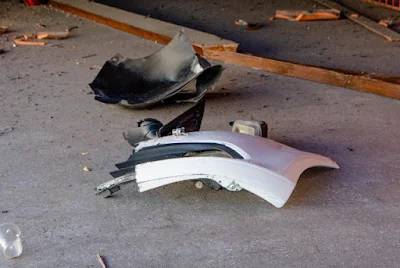estrutura. Pedaços de um para-choque de um veículo de cor branca foram